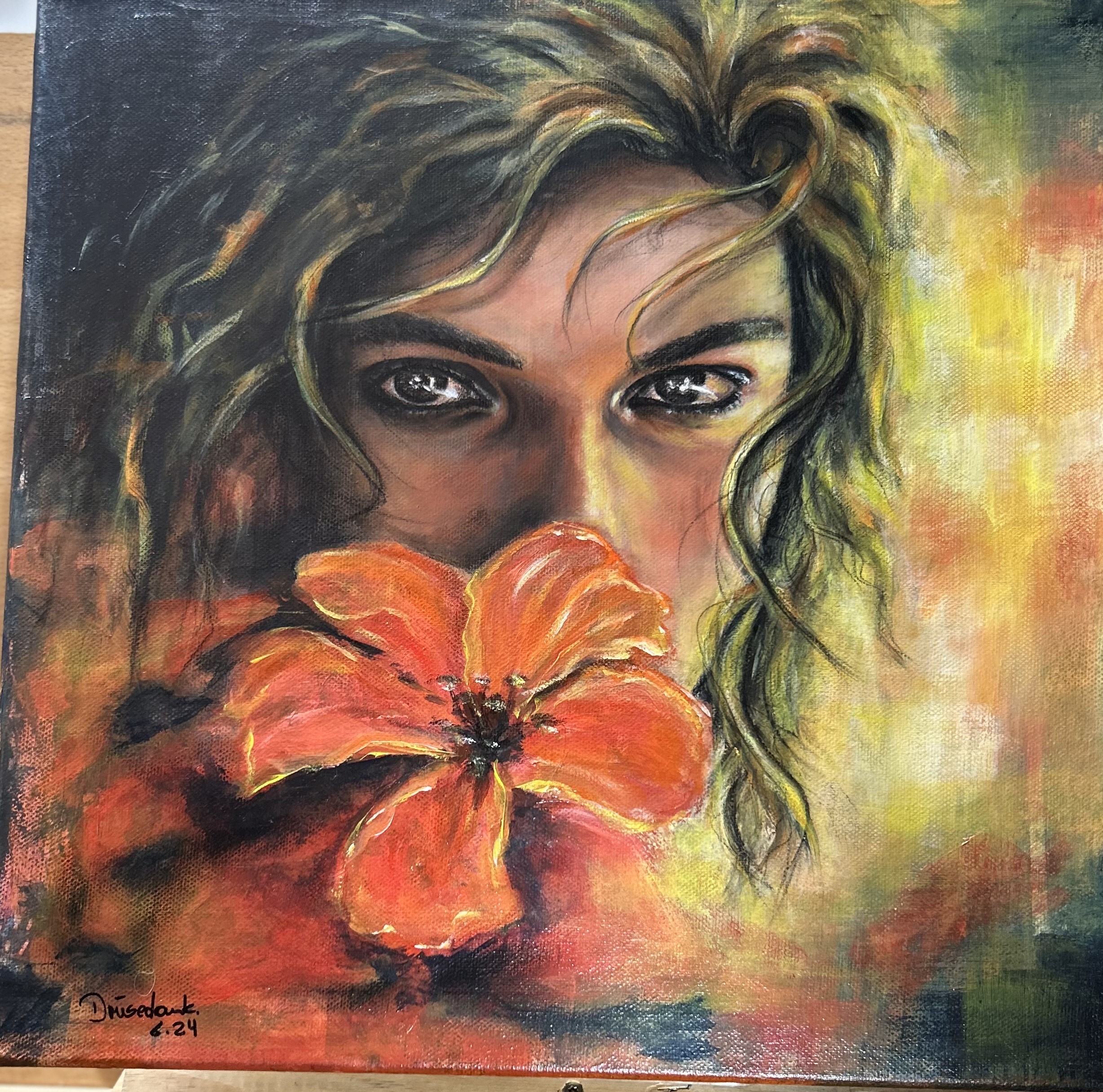 Ein ausdrucksstarkes Werk, das durch warme Farben und kontrastreiche Lichtführung besticht. Der Blick der Frau – eindringlich und geheimnisvoll – ist auf den Betrachter gerichtet, während die Blüte wie ein Schutzschild ihre Lippen umrahmt. Das Zusammenspiel von Licht, Farben und Emotion macht dieses Bild zu einem sinnlichen Erlebnis.